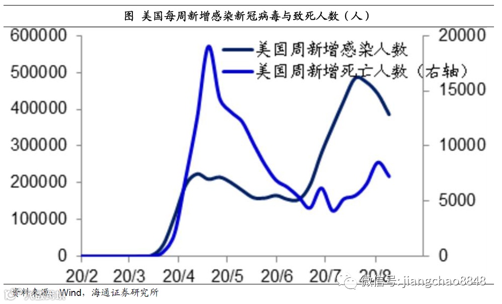 但如果我们看另外一个指标,新冠病毒导致的死亡人数,其实是在今年4月初就达到了高峰。哪怕现在全球每周感染新冠病毒的人数是4月初的3倍,但是当前每周死于新冠病毒的人数在4万人左右,明显低于4月初的5万多人。这意味着虽然新冠病毒的疫苗还没有正式出现,但人类应对这种病毒的经验越来越丰富,新冠病毒对人类整体伤害的高峰期或已过去。