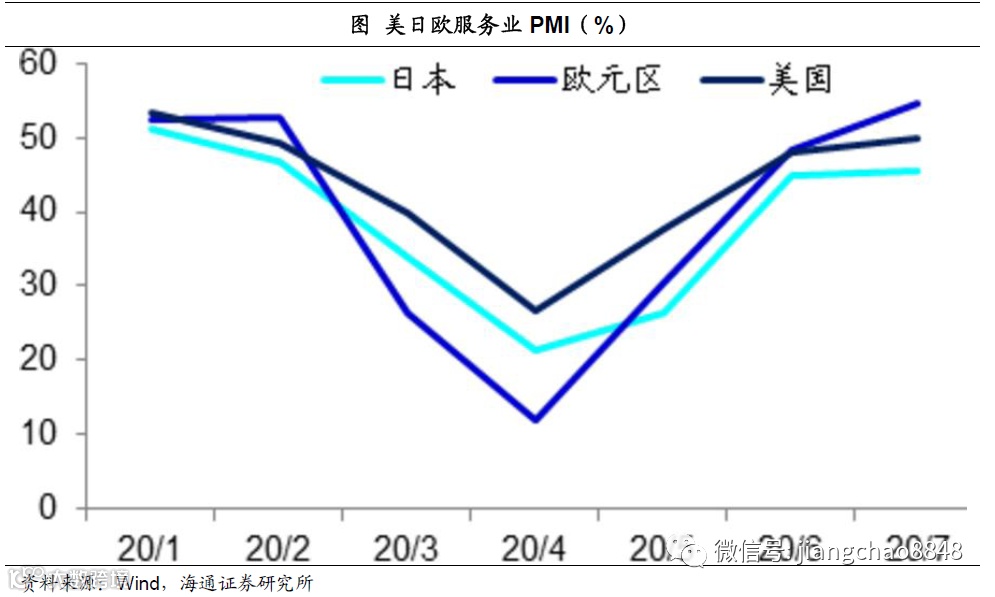 即便是受疫情影响最严重的服务业,随着人口流动性的改善,在5月份以后美日欧的服务业PMI指数也开始持续回升,7月份美欧的服务业PMI均超过50,而日本也升至45.4。