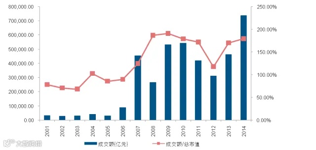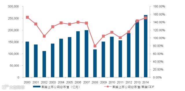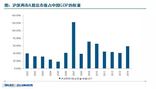 这张图是这几年A股占GDP市场的比重。我们在这两年的研究做了一个假设,提出什么样的设想呢?就在五年或者是最多十年的时间之内,我们可以看到股票市场,还有债券市场的规模很快将突破100万亿,目前GDP规模也将突破100万亿。