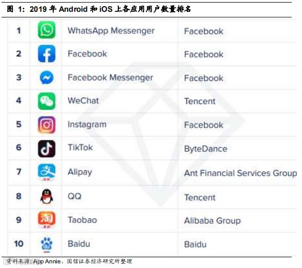 字节跳动流量优势显著且提升迅速。根据App Annie的《2020年移动状况》,从2019年Android和iOS上各应用用户数量排名来看,TikTok排名第6位;根据AppTrace的调查,TikTok在2019年2月的全球应用下载量排名中从269位跃升至第4位。