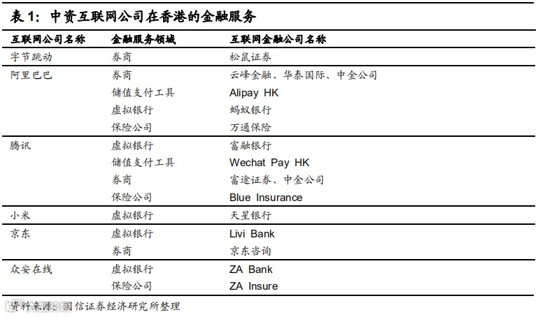 阿里巴巴、腾讯、小米、京东等金融巨头在香港金融业已进行了更早的布局。阿里巴巴已布局云锋金融、蚂蚁银行、万通保险、Alipay HK等,且参股了华泰证券和中金公司;腾讯已布局富融银行、富途证券、微信支付(香港)、微蓝保险等实现金融布局,同时也参股了中金公司;小米布局了天星银行;京东布局了Livi Bank和京东咨询。