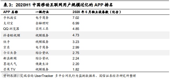 在国内市场,字节跳动依然处于流量龙头地位。从2020年上半年中国移动互联网短视频主流APP用户规模来看,抖音以4.73亿台月独立设备数排名第1,同比增长16.1%;从2020上半年中国移动互联网用户规模过亿的APP排名来看,抖音排名第4,字节跳动以2.75亿台月独立设备数排名第7。