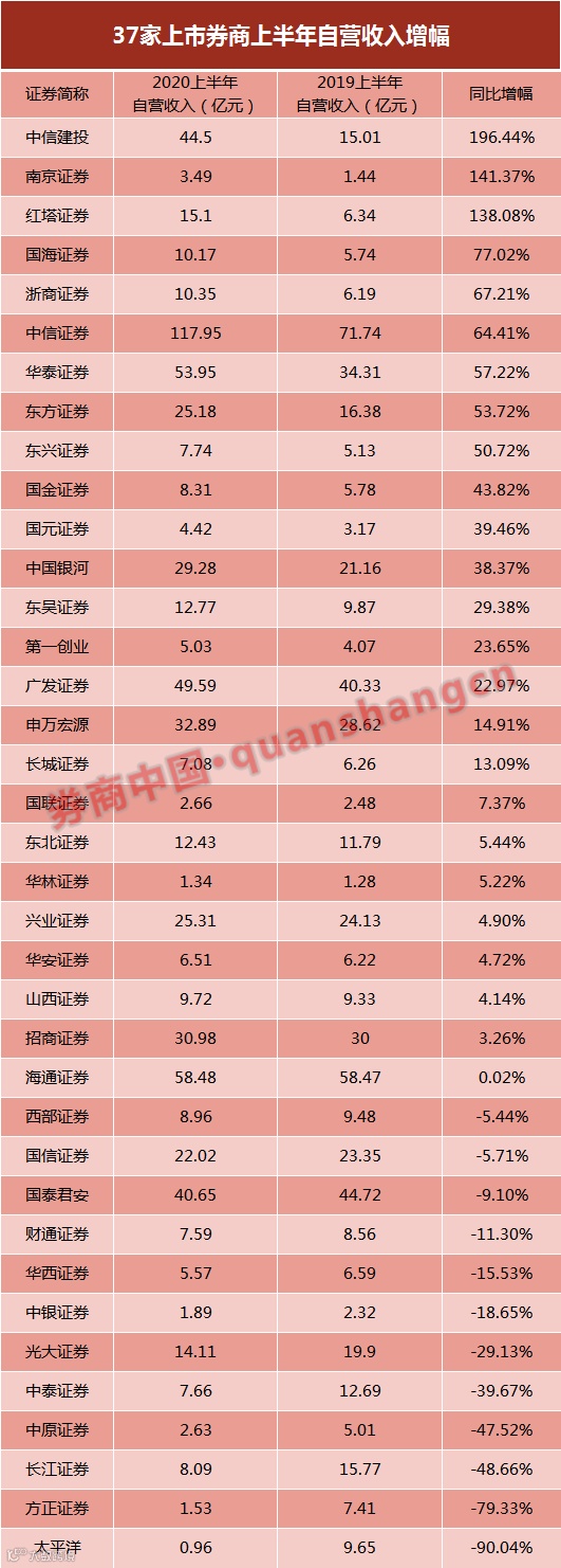 目前已有37家A股上市券商发布了2020年半年报,很多券商的业绩表现为“成也自营,败也自营”,综合实力较强的头部券商越来越展示良好的投资交易能力,但也有不少券商受制于资本实力和专业投资能力不足,上半年自营收入欠佳。