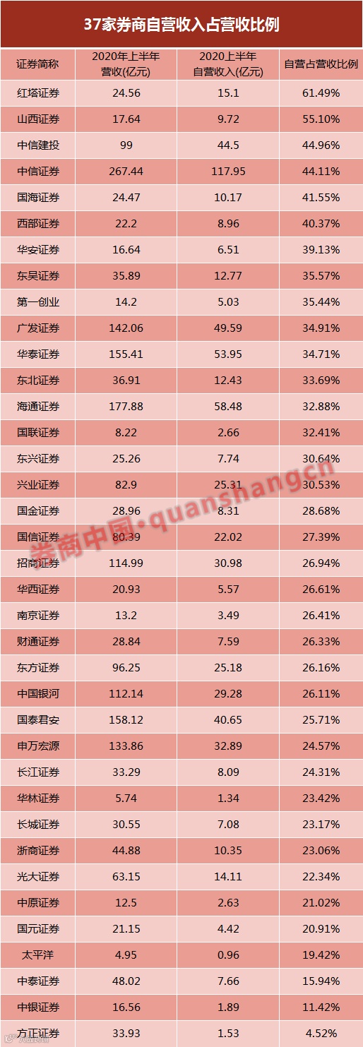 从自营收入占营收的比例来看,有16家券商自营收入占比超过30%,其中红塔证券、山西证券分别取得15.10亿元和9.72亿元的自营收入,占上半年营收的比例分别为61.49%和55.10%;中信建投、中信证券、国海证券、西部证券的自营占比超过40%。