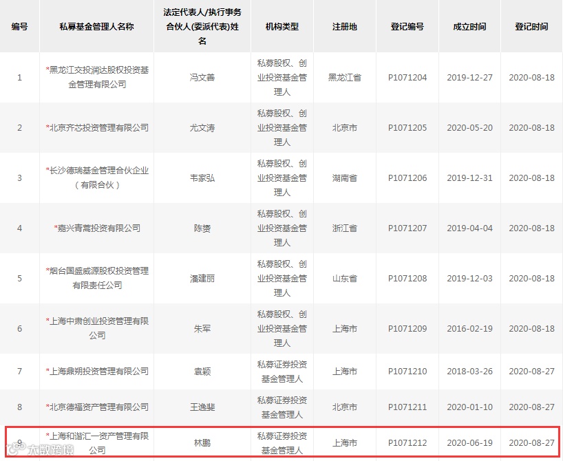 8月29日,中国基金业协会信息显示,由昔日明星公募基金经理林鹏创立的“上海和谐汇一资产管理有限公司”(简称“和谐汇一”)日前正式完成私募备案登记。