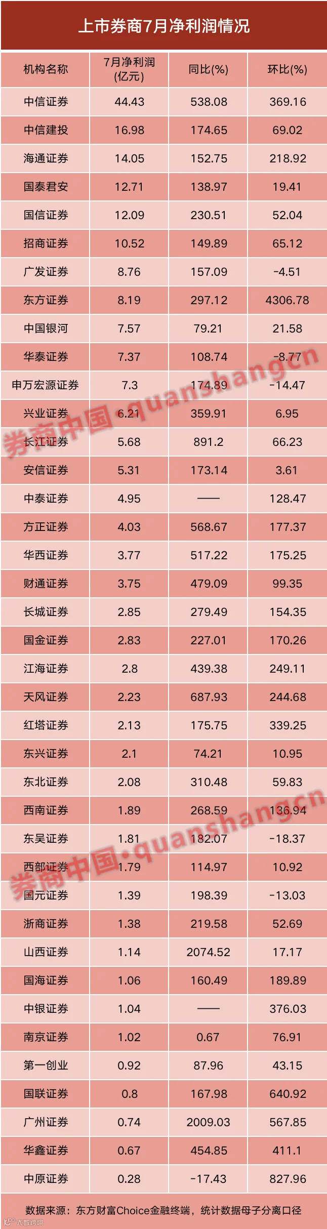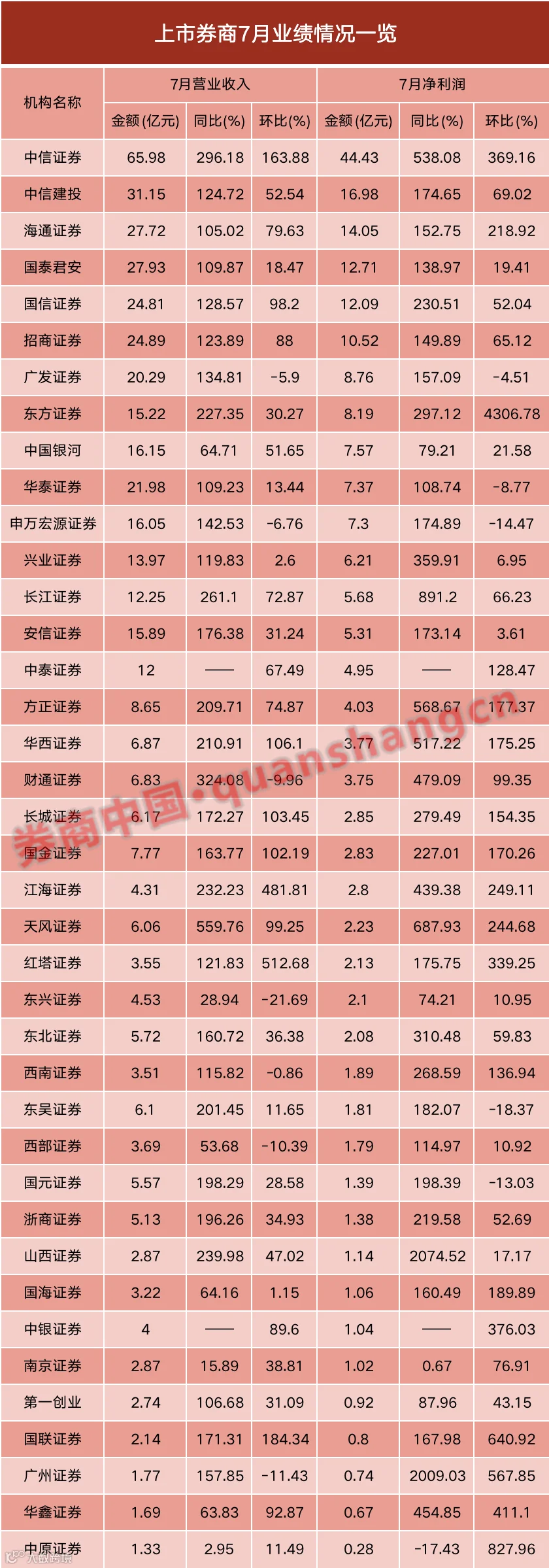 截至8月6日晚间8点,已有39家上市券商(含概念股)发布7月券商月度业绩数据,大多赚的盆满钵满。