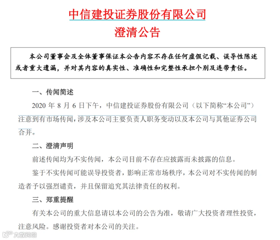 不过,8月6日晚间,中信建投对此传闻再次发布澄清公告。“公司注意到有市场传闻,涉及本公司主要负责人职务变动以及本公司与其他证券公司合并。”中信建投称,该传闻为不实传闻,目前不存在应披露而未披露的信息。
