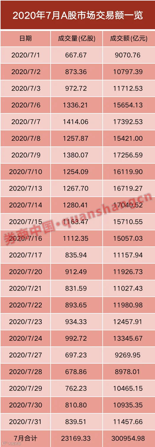 从两市成交额来看,7月23个交易日中有20个交易日成交额超过万亿元。其中,7月7日总成交额最大,为17398.08亿元。沪深两市全月总成交额超过30万亿元,创出历史新高。