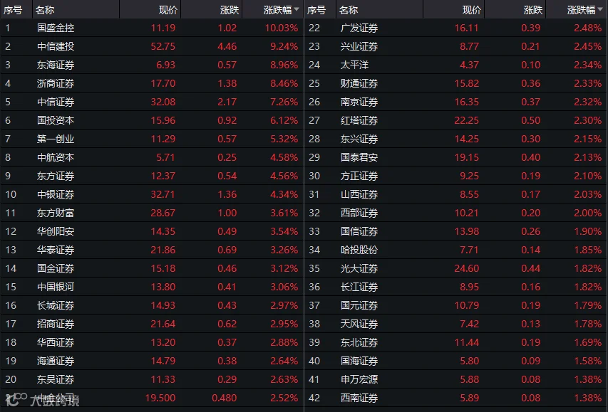 8月6日午后,券商股异动拉升,中信证券、中信建投尾盘放量冲击涨停,多只券商概念股股价走高。