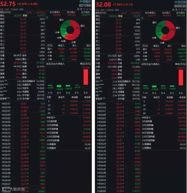 截至8月6日收盘,中信建投、中信证券均未封住涨停。中信建投当日以52.75元/股报收,收涨9.24%;中信证券以32.08元/股报收,收涨7.26%。其中,中信建投尾盘最后半小时成交29.98亿元,占全天成交额66.7%;中信证券最后半小时成交68.96亿元,占全天成交额59.8%。两股当日分别获主力净流入10.26亿和20.23亿元。
