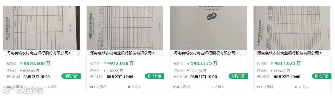 据阿里拍卖平台信息,河南襄城农商行4笔股权将于8月27日10点至28日10点在郑州市人民法院淘宝网司法拍卖网络平台上进行公开拍卖。