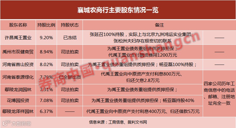 5月初,双建商贸、首山投资、龙润园林、花博园投资各自持有的襄城农商行股权又同时接受询价评估,并于7月底集体被司法拍卖。7月1日,禹王置业持有的襄城农商行9.2%股权也被司法冻结。