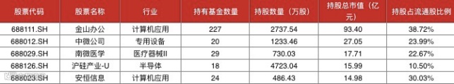 除了被动产品的布局以外,公募基金正积极参与科创板主动投资。Wind数据显示,截至2020年6月30日,主动偏股型基金2020年二季报前十大重仓股中约80只科创板个股,其中重仓持有金山办公的基金有227只,持股总市值93.4亿元,占流通股比例38.72%;此外中微公司和南微医学基金持股市值也较多,分别为27.05亿元和17.71亿元。