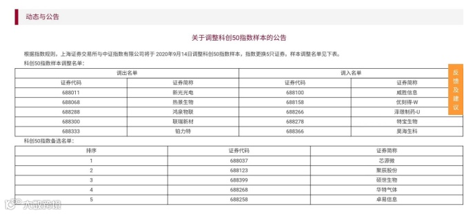 根据上交所方面的公告,根据编制规则,此次科创50指数更换5只样本,新光光电、热景生物、鸿泉物联、联瑞新材和铂力特被调出,威胜信息、优刻得、泽璟制药、特宝生物和昊海生科被调入。