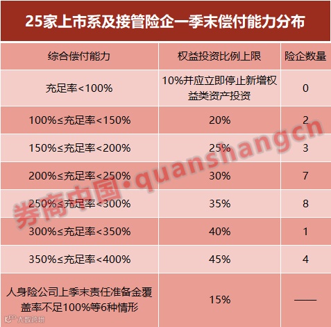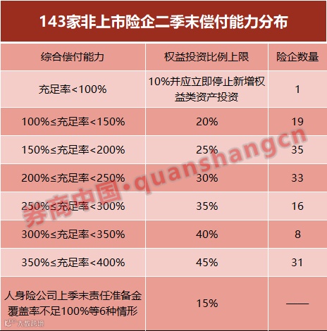 另外还有25家上市系险企和被接管险企未发布二季度末数据,据其一季度末数据,有5家综合偿付能力在200%以下,若二季度没有大的提升,其权益比例上限也将下调。其中,天安人寿、华夏人寿的权益投资上限或将降至20%,国华人寿、太保安联健康、易安财险的权益投资上限或将降至25%。