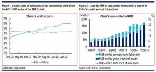 图1:中国占全球出口份额及以人民币计价的交易