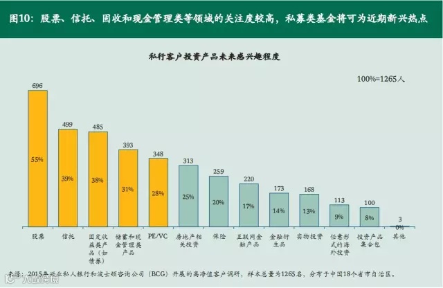 可投资资产大于3000万的高净值客户将股票、信托和房地产作为主要的投资手段,对于现金管理类和固定收益类产品的热度较其他客户而言更少一些,主要是因为高净值客户在财富积累有相当量的前提下,愿意积极寻求其他风险与收益率稍高的替代品。