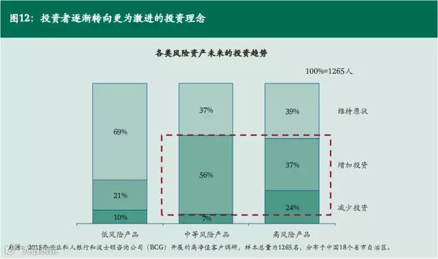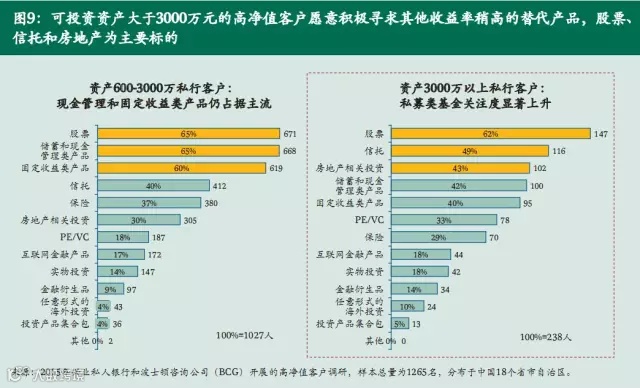 与此同时,我们也看目前市场上的分化发展。可投资资产在600-3000万之间的客户最为关注的是产品收益率,一些流动可保证、产品收益相对高的标准化产品将能较好地程度满足这些客户的需求;而可投资资产大于3000万元的高净值客户对于资金流动率和综合收益率更为着重,因而倾向于选择可基于进行定制及组合配置的产品和服务。