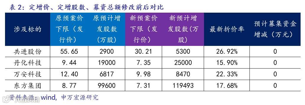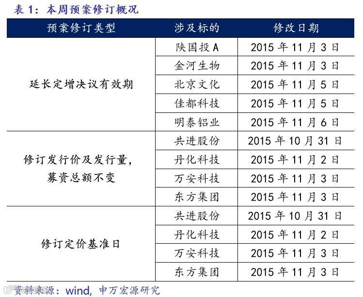 6、延期项目增加,定增底价下调幅度持续收窄。9宗修改预案项目中有5宗:陕国投A、金河生物、北京文化、明泰铝业分别将定增决议顺延12个月,佳都科技则将定增决议顺延至本次非公开发行实施完毕,以待更好的发行时机。一年期项目中,3宗下调预案价下限,1宗下调发行价格,下调幅度均值为26%,与上周大致持平。三年期未出现修改定增价项目。