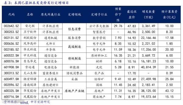 2、本周重点关注产业链优化布局类定增项目标的:荣之联、风华高科、华天科技、海南瑞泽。