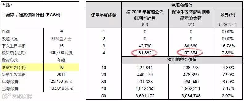2015年保单现金价值总额应为:171,899港元,实际现金价值总额为:178,348港元,红利率超过预期3.75%。