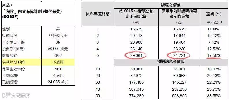 2015年保单现金价值总额应为:24,721美元,实际现金价值总额为:29,061美元,红利率超过预期17.56%。