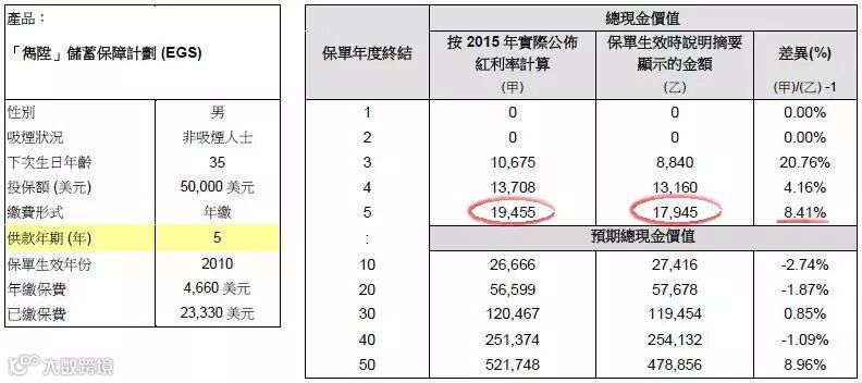 2015年保单现金价值总额应为:17,945美元,实际现金价值总额为:19,455美元,红利率超过预期8.41%。