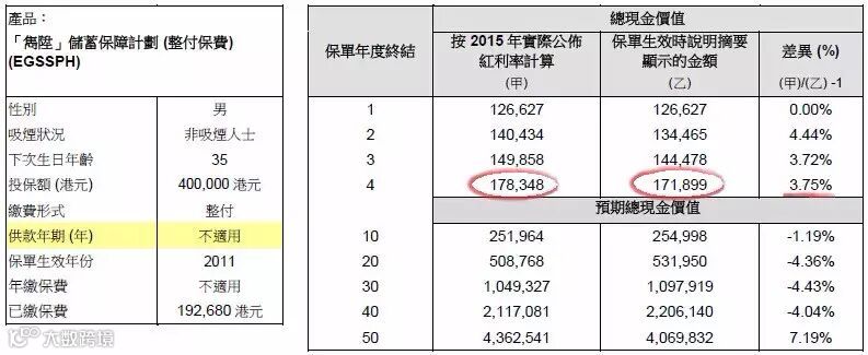 2015年保单现金价值总额应为:171,899港元,实际现金价值总额为:178,348港元,红利率超过预期3.75%。