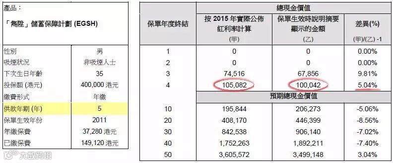 2015年保单现金价值总额应为:100,042港元,实际现金价值总额为:105,082港元,红利率超过预期5.04%。