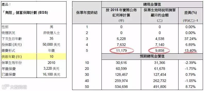 2015年保单现金价值总额应为:9,858美元,实际现金价值总额为:11,179美元,红利率超过预期13.40%。