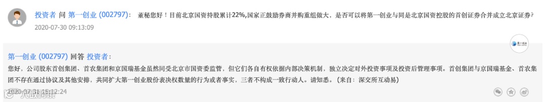 该问题也受到投资者的关注,在投资者互动平台上,第一创业对此回复称,公司股东首创集团、首农集团和京国瑞基金虽然同受北京市国资委监管,但它们各自有权依据内部决策机制,独立决定对外投资事项及投资后管理事项。首创集团与京国瑞基金、首农集团不存在通过协议及其他安排,共同扩大第一创业股份表决权数量的行为或者事实,三者不构成一致行动人。