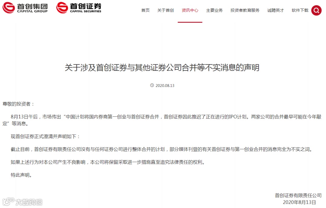 8月13日路透消息称,第一创业与首创证券将要合并,首创证券因此推迟了正在进行的IPO计划,据路透援引的消息人士,两家公司的合并最早可能在今年敲定。
