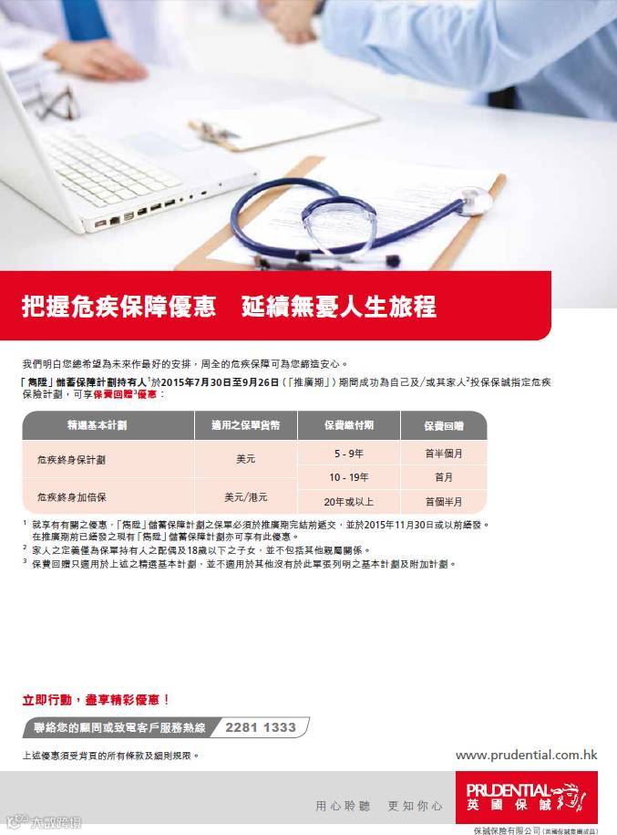 「雋陞」儲蓄保障計劃保單持有人(1)於 2015 年 7 月 30 日至 9 月 26 日(「推廣期」)期間成功為自己及/或其家人(2)投保保誠指定危疾保險計劃,可享保費回贈(3)優惠: