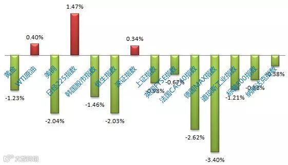市场表现:全球股市下跌,欧洲股市大跌,A股周内巨震,黄金、铜下跌,石油微涨。