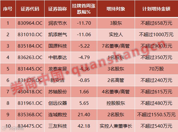 事实上,截至上周五(7月31日),32家首批精选层挂牌企业中,已有15家公司相继公告了董监高即将增持或股东承诺限售的消息。凯添燃气更是股东承诺限售和实控人计划增资双举措;再加上流金岁月的回购计划,首批精选层企业近半数都已推出了“稳股价”举措。