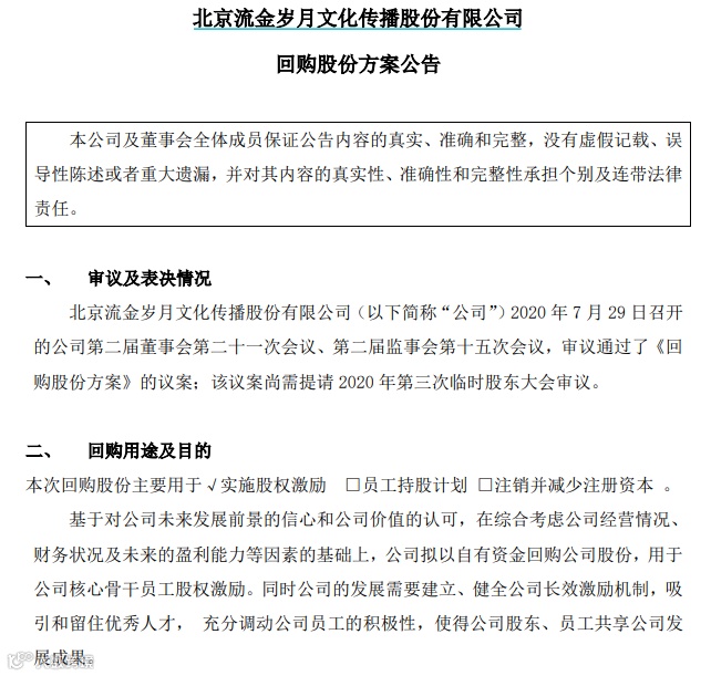 在此基础上,流金岁月预计此次回购资金总额不超过4320万元,回购股份的实施期限为自股东大会审议通过回购方案之日起不超过6个月。