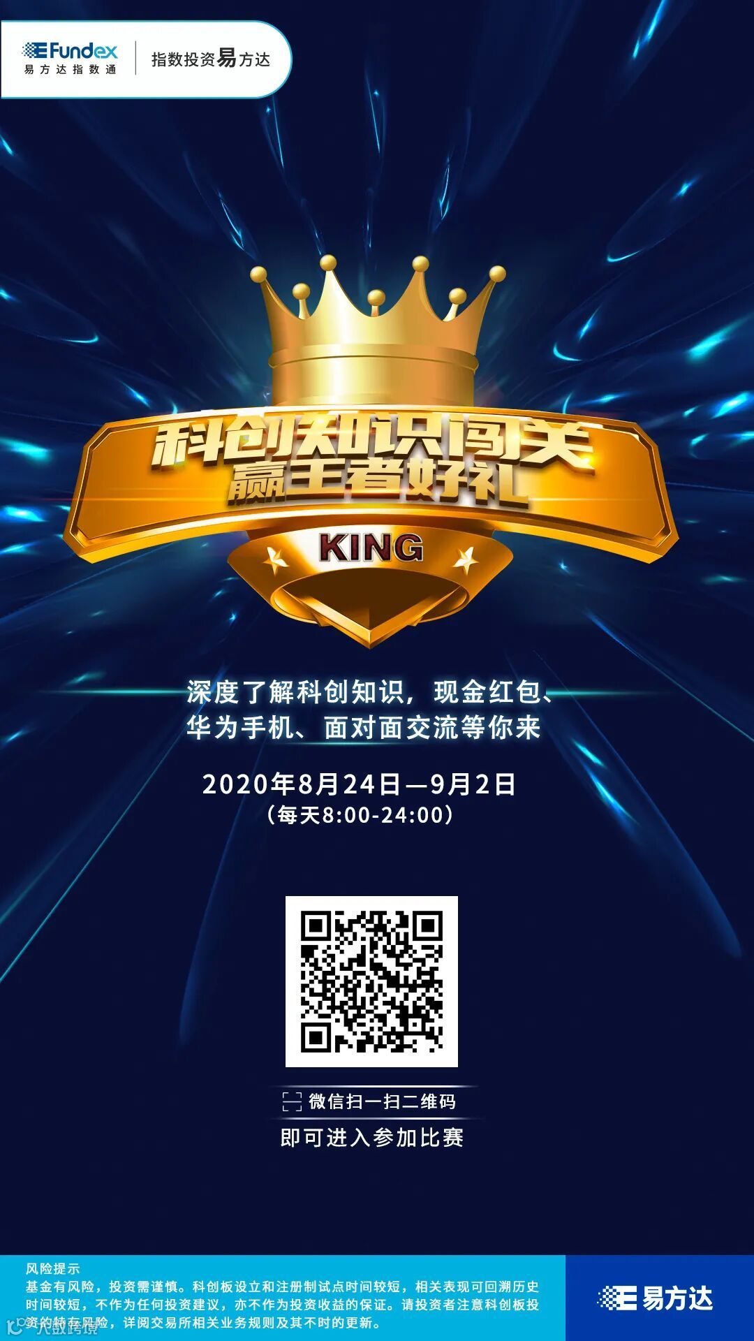即日起至9月2日,易方达开展以“科创知识闯关,赢王者好礼”为主题的科创知识大赛,通过有奖问答的形式帮助投资者深入了解科创知识,每闯关成功点亮段位徽章即可抽取随机红包,段位越高红包金额越大。我们将在达到科创王者段位的所有用户中,随机抽取1名幸运用户获得一部华为P40 5G手机,随机抽取3名幸运用户与基金经理共进午餐、参与直播。快扫描下方海报二维码参加吧!