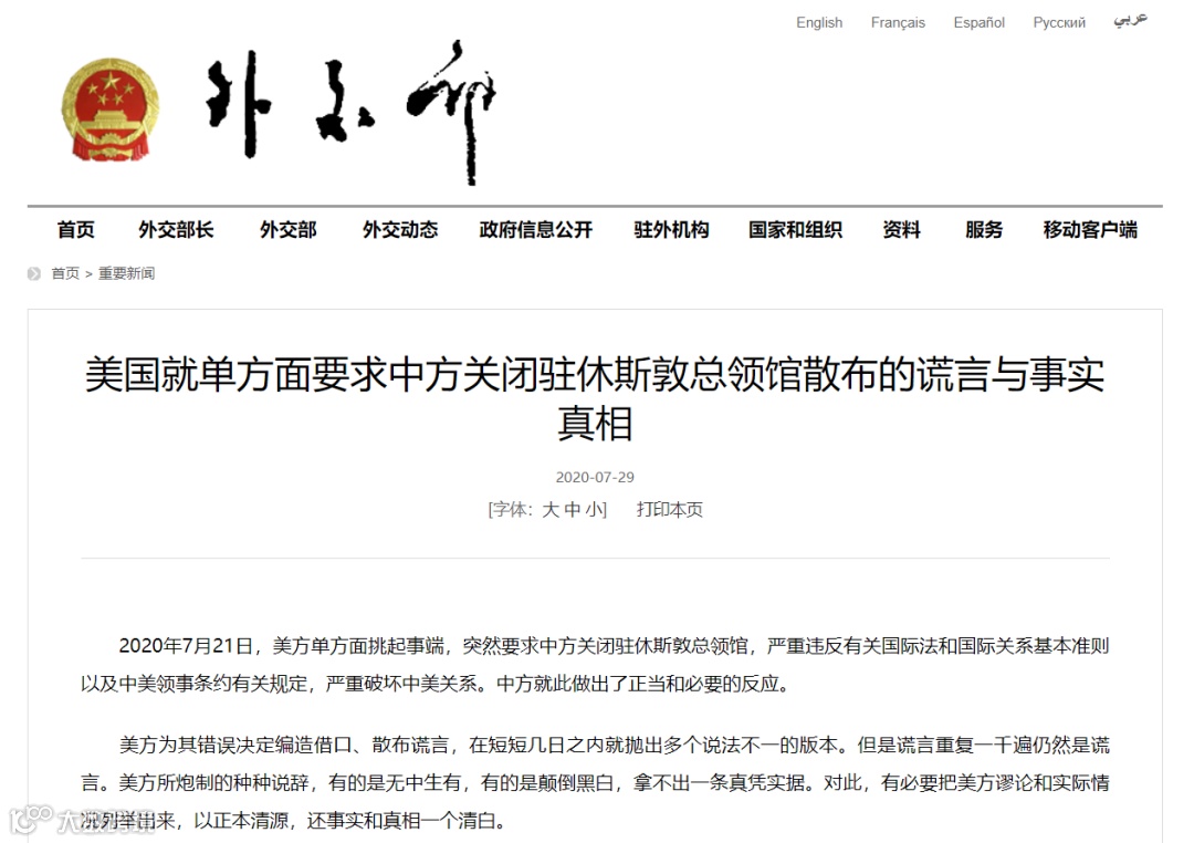 7月29日凌晨,外交部网站发布重要新闻,阐述了“美国就单方面要求中方关闭驻休斯敦总领馆散布的谎言与事实真相”。