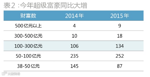 第四,从财富量级看,超级富豪的人数今年也大大增加:百亿富豪比2014年增加41位,达到161位,占上榜富人总数的近1/3;身家低于50亿元的仅87人,相当于2014年的60%(表2)。这再次体现出富人群体内财富集中度仍在提升。