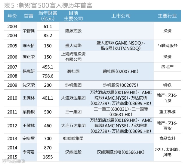 李河君旗下的汉能薄膜发电(00566.HK)2014年股价涨幅高达256%,2015年涨势更为凌厉,由年初的2.81港元/股上涨到3月5日的7.3港元/股,从而带动李河君的财富一路上扬。今年李河君以1655亿元的身家继续蝉联新财富500富人榜首富,他也是本榜推出以来第四位两次登顶首富的企业家,其余三位分别是隆源控股的荣智健、碧桂园的杨惠妍和大连万达的王健林(表5)。