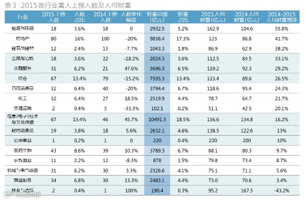 从上榜富人人数看,来自房地产、TMT、综合、医药生物以及商业服务业的富人分列前五(表3)。和去年不同的是,商业服务业的上榜人数取代属于制造产业的日用消费品行业,挤进了前五。这一变化的背景是,2013年起,中国第三产业增加值已经超过第二产业,2014年,最终消费对GDP的贡献率超过投资4个百分点,中国经济正从要素驱动、投资驱动转向消费驱动、创新驱动。