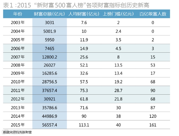 2014年,中国GDP增速降至7.4%,创24年新低。2015年第一季度,在一系列宽松措施的支撑下,GDP增速勉强保7%。尽管新常态下实体经济面临的形势严峻,富人的身家仍然持续上冲,其表现是今年新财富500富人榜的各项财富指标创出新高(表1)。