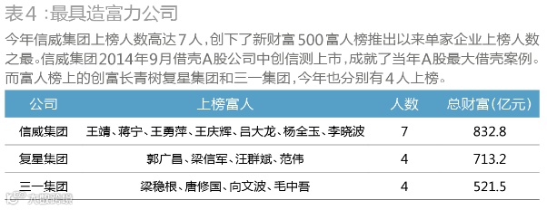 第三,新财富500富人榜此前从未有过财富突破千亿级的富人,而今年身家过千亿元的富人达到4位,他们分别是汉能控股的李河君、阿里巴巴的马云、万达的王健林、腾讯的马化腾。马云、王健林受益于旗下资产上市,李河君和马化腾则因为旗下上市公司股价上涨。