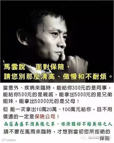 馬雲說:保險是後路,在春風得意時布好局,才能四面楚歌時有條路。有錢時,錢不值錢。沒錢時,人不值錢。要想讓人永遠值錢,就必須用您現在有能力的時候,把賺到的錢拿出一部分來規劃好不確定的將來。