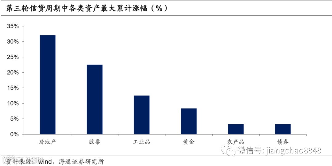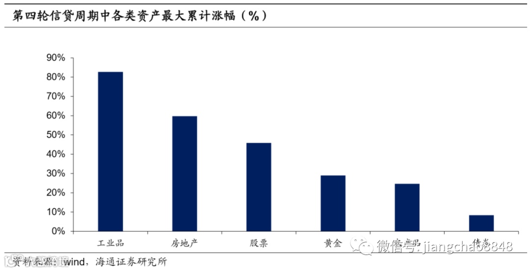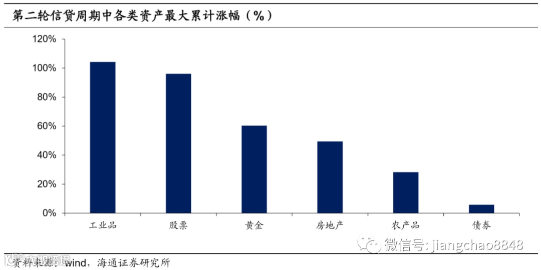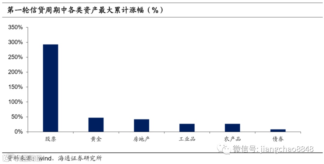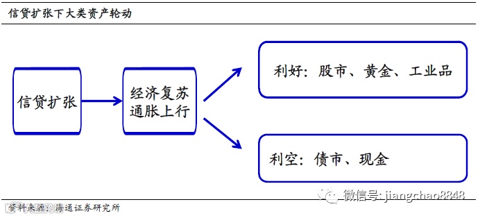 过去每轮信贷扩张周期中,经济复苏,通胀回升,上市公司盈利增加,支撑股市走牛。但经济的好转使融资需求扩大,带动利率上行,债券价格随之下降。而经济好转会带来工业品需求回升,推升工业品价格。同时,货币的超发带来的通胀上行会吸引资金流入房地产市场,并增加黄金配置用于保值。