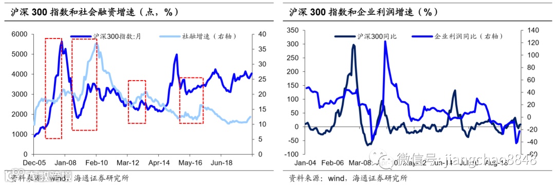 另一方面在于信贷扩张带动经济增长,增强上市公司的盈利能力。除了2014-2015年的并购牛市以外,沪深300走势与社会融资增速和上市公司净利润高度相关,业绩支撑股价上升。信贷扩张周期中,企业容易通过加杠杆扩大公司规模,而经济的回暖使需求上升,企业盈利能力大幅提升,成为牛市基础。