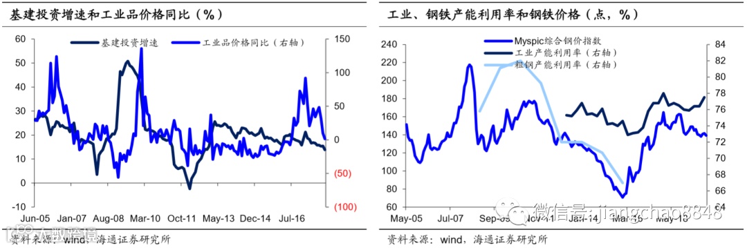 过去每轮经济的复苏均由投资拉动,投资增速回升导致工业品需求旺盛,拉动工业品价格上升。例如08年底推出“四万亿”政策后,09年基建投资增速全年保持在40%以上的高位,10年上半年仍位于20%以上。由于投资回升导致对工业品的需求猛增,09年10月工业品价格开始飞速上涨, 10年1月达到历史最高峰,同比增长超过135%。