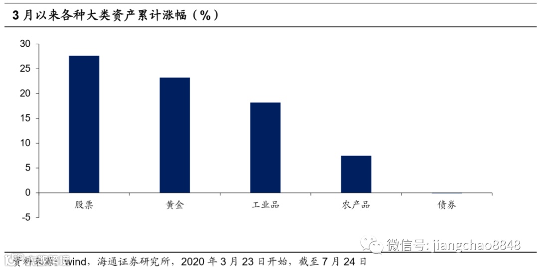 而目前的大类资产价格表现其实已经反映出这一情况。3月至今,股市涨幅最高,已达到27.6%,黄金和工业品分别以23.2%和18.2%的涨幅居于第二位和第三位。尽管今年全国房地产价格平均涨幅不高,但是深圳等部分城市明显出现房价上升较快的情况。相比之下,债券投资收益率垫底,累计下跌0.1%。