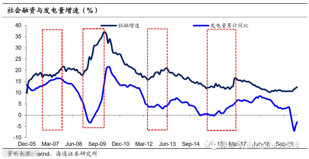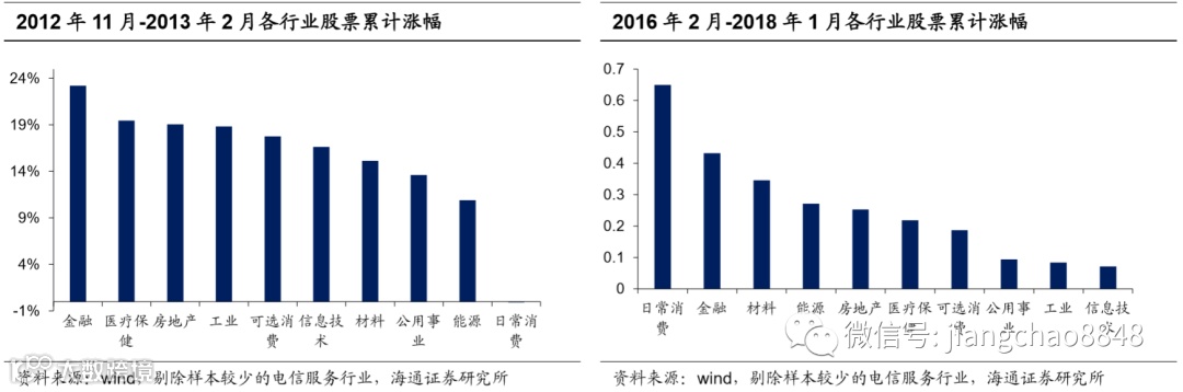 第三轮信贷扩张周期中股市上涨阶段为2012年11月-2013年2月,在这轮仅维持了4个月的短牛期间表现最好的行业为金融行业,其次是医疗保健、房地产和工业,三者表现非常接近。而第四轮信贷扩张周期中股市上涨阶段为2016年2月-2018年1月,虽然2017年下半年开始金融去杠杆,但发电量数据却持续上升,经济持续好转,股市仍处于上升期。这轮慢牛期间表现最好的行业分别是日常消费、金融和材料,能源和房地产表现相当,紧随其后。