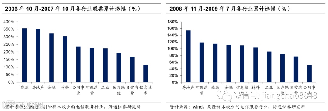 具体来说,第一轮信贷扩张周期中股市上涨阶段为2006年10月-2007年10月,此轮超级牛市期间表现最好的行业分别是能源、房地产、金融和材料,前两个行业涨幅差距很小。而第二轮信贷扩张周期中股市上涨阶段为2008年11月-2009年7月,期间表现最好的行业分别是房地产、可选消费、能源和金融,房地产行业涨幅显著领先其他行业。